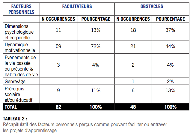 Les facteurs personnels comme la motivation, l’envie et le désir sont déterminants pour la mise en œuvre des projets d’apprentissage. Le bon fonctionnement des processus cognitifs comme par exemple, la mémoire, est également reconnu par les participants comme des facteurs facilitant les apprentissages. De même, pouvoir s’appuyer sur un certain nombre de connaissances scolaires préalables constitue un réel atout. Certains facteurs environnementaux, par exemple l’aide de l’équipe éducative ou de la famille, sont également considérés comme des facilitateurs. Avoir accès à du matériel adapté comme un ordinateur, des livres ou encore une machine à calculer est perçu comme pouvant faciliter la mise en œuvre du projet d’apprentissage.